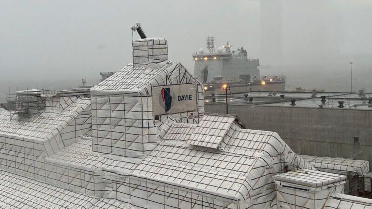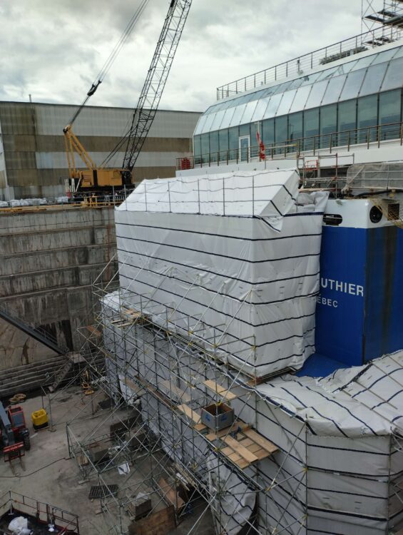Abris en toile Tuftarp pour des travaux de maintenance sur un navire en cale sèche.