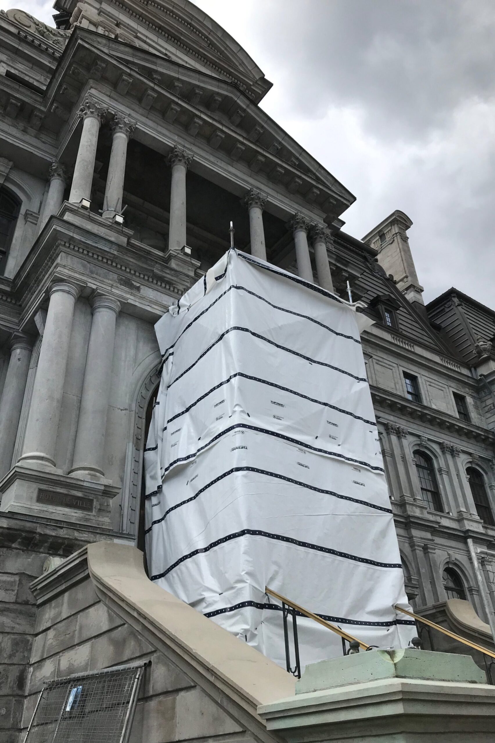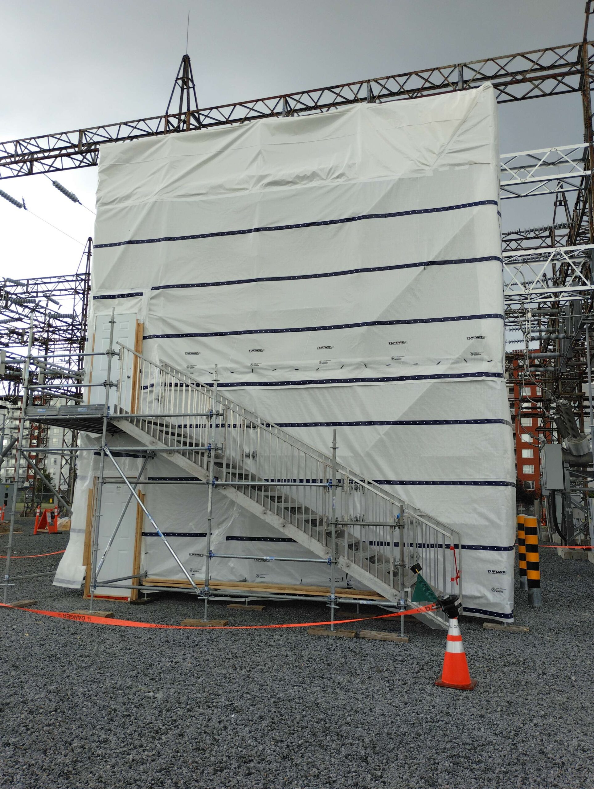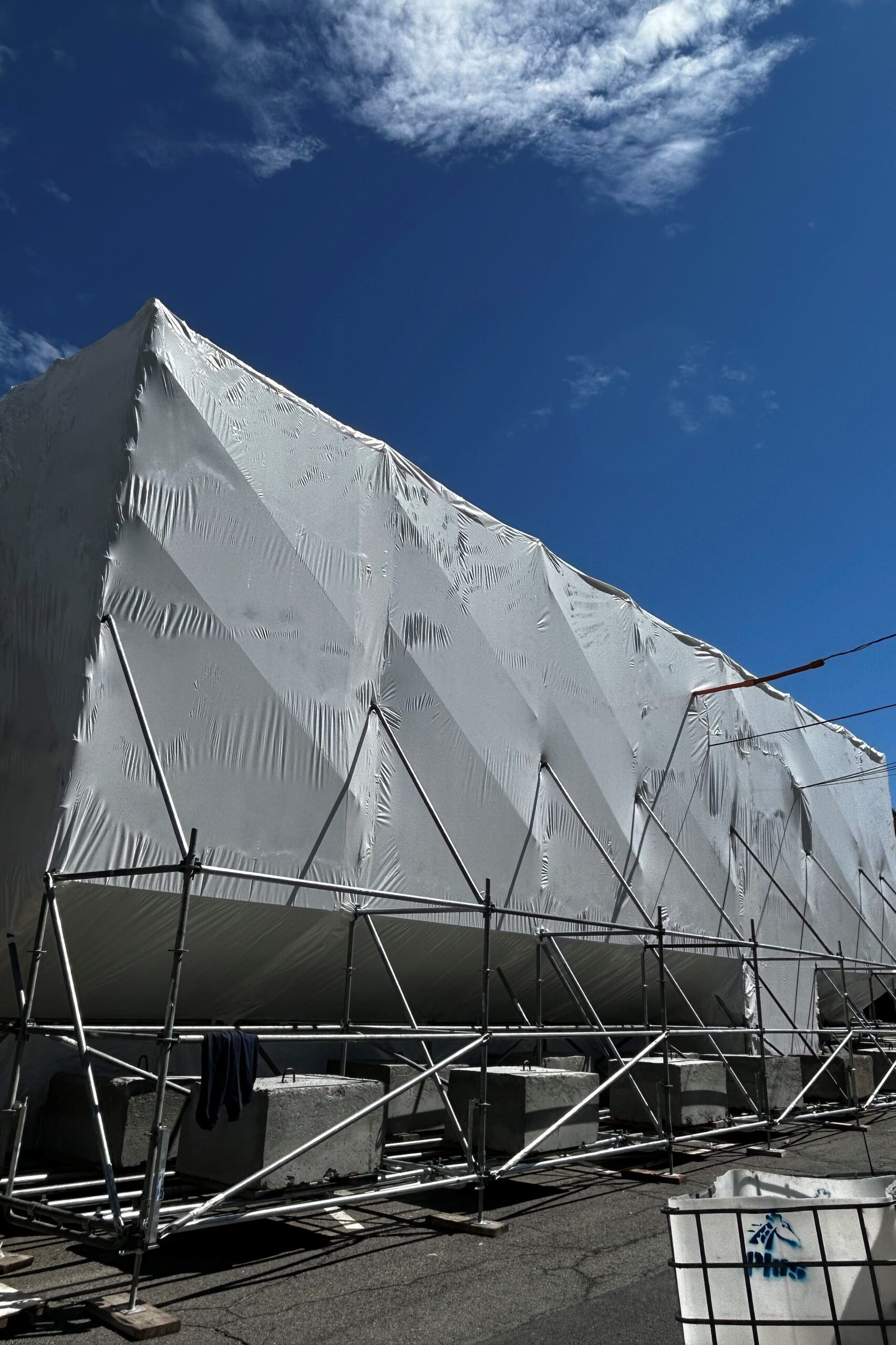 Plan de la structure d’un abris en Shrinkwrap pour la réfection de l’enveloppe extérieure d’un édifice.