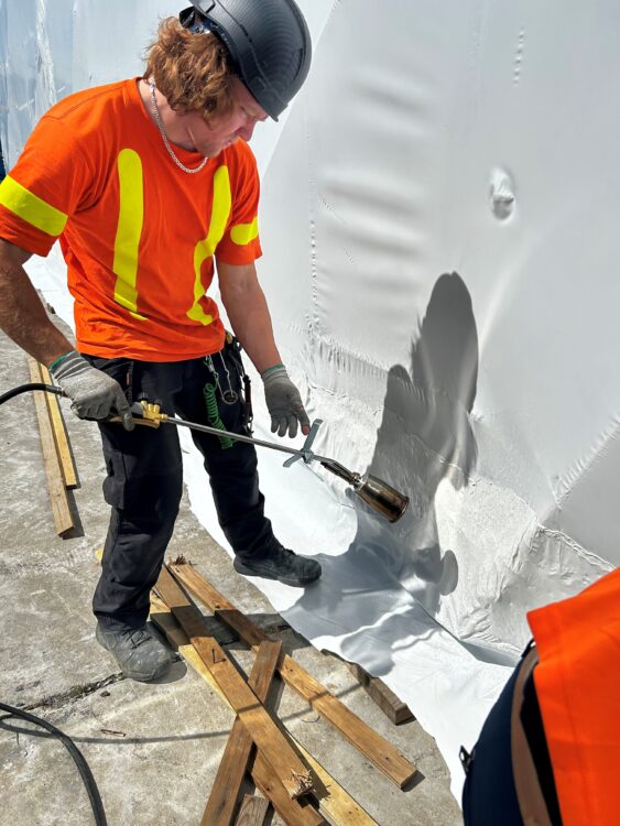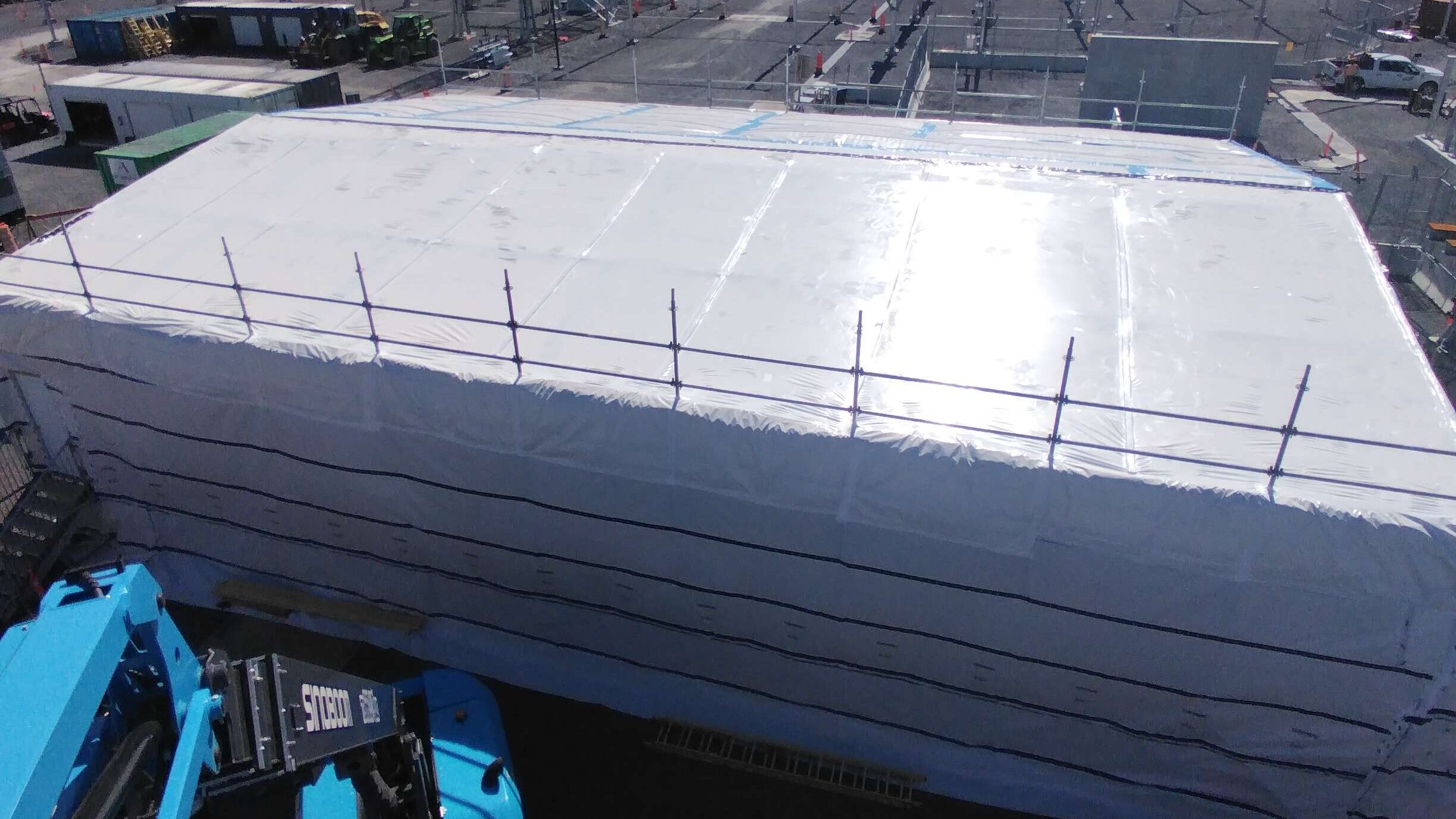 Film plastique chauffé qui se rétracte pour former une membrane parfaitement scellée autour de la structure.